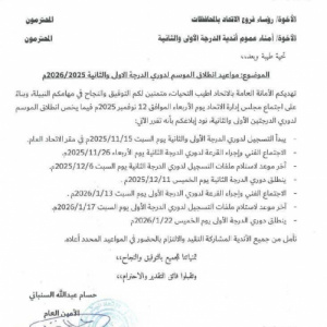 أعلن الاتحاد اليمني لكرة القدم، امس السبت 15 نوفمبر 2025، مواعيد انطلاق الموسم الرياضي الجديد لدرجتي الأولى والثانية، إضافة إلى مواعيد التسجيل والاجتماعات الفنية والقرعة.وبحسب التعميم الصادر عن...