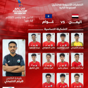 أعلن الجهاز الفني لمنتخبنا الوطني للناشئين التشكيلة الأساسية التي سيخوض بها مواجهة غوام، ضمن الجولة الثانية من التصفيات الآسيوية المؤهلة لكأس آسيا تحت 17 عاماً (المجموعة الثانية) والمقامة في قير...