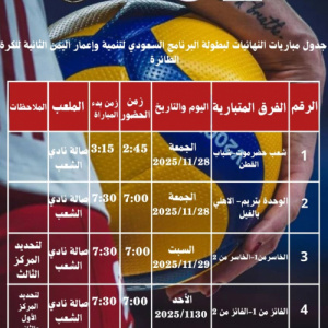 البطولة التنشيطية الثانية للكرة الطائرة لأندية حضرموت (بطولة البرنامج السعودي)الجمعة افتتاح المربع الذهبي .. شعب حضرموت ووحدة تريم يواجهان شباب القطن وأهلي الغيلالسبت مواجهة المركز الثالث.. والأ...