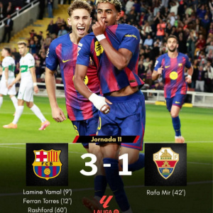 داوى فريق برشلونة الأول لكرة القدم جراح خسارته أمام غريمه ريال مدريد في الكلاسيكو، الأسبوع الماضي، بالفوز 3ـ1 على ضيفه إلتشي، الأحد، ضمن منافسات الجولة الـ 11 من الدوري الإسباني.وأحرز لامين يامال، وفي...