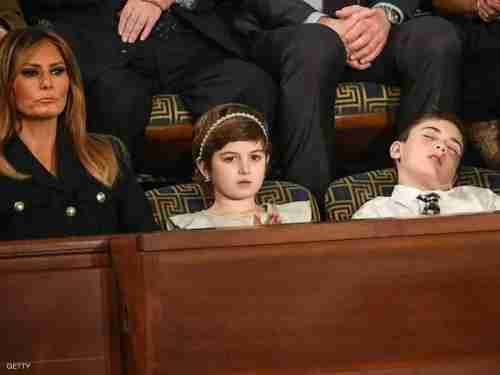والتقط عدسات المصورين الطفل جوشوا ترامب (11 عاما) نائما، وقد أسند رأسه إلى ظهر الكرسي، خلال خطاب ترامب عن حالة الاتحاد الذي استمر نحو ساعة و20 دقيقة.