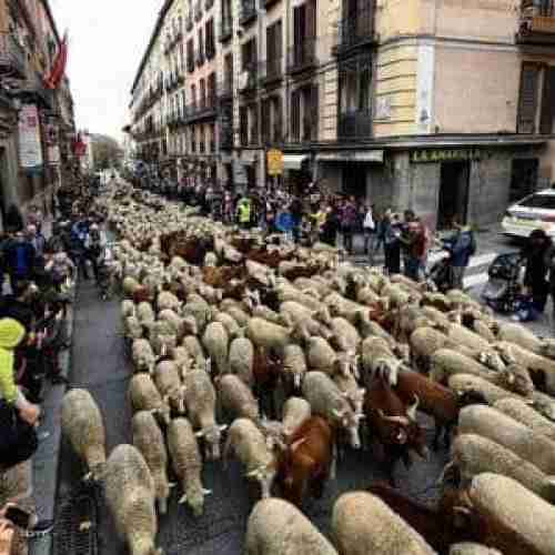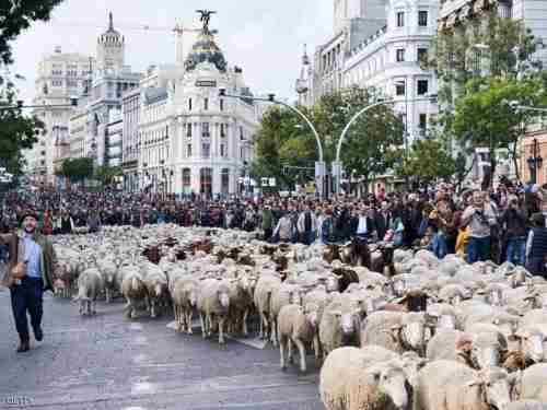 احتلت الأغنام شوارع العاصمة الإسبانية مدريد، الأحد، حيث ساق الرعاة قطعانهم من الأغنام والماعز في قلب المدينة، مارين بمسارات قديمة للهجرة السنوية.