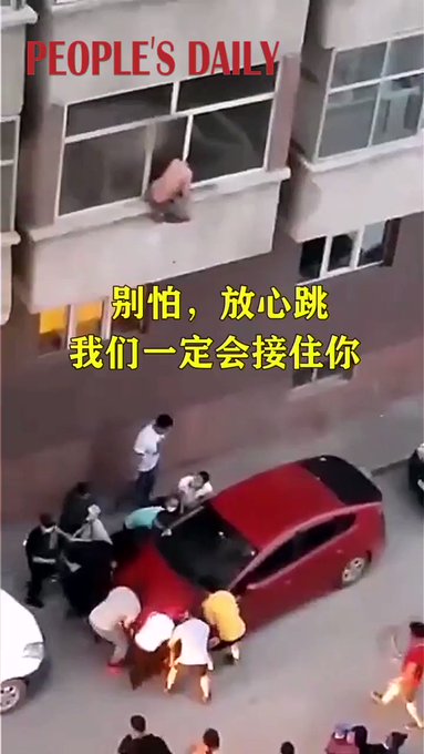 الواقعة التي حدثت في الصين ونشرتها صحيفة "الشعب" الحكومية، تظهر رجلا عالقا في نافذة يتصاعد منها الدخان، ولا حل أمامه سوى القفز منها هربا من الحريق الذي يلتهم منزله.